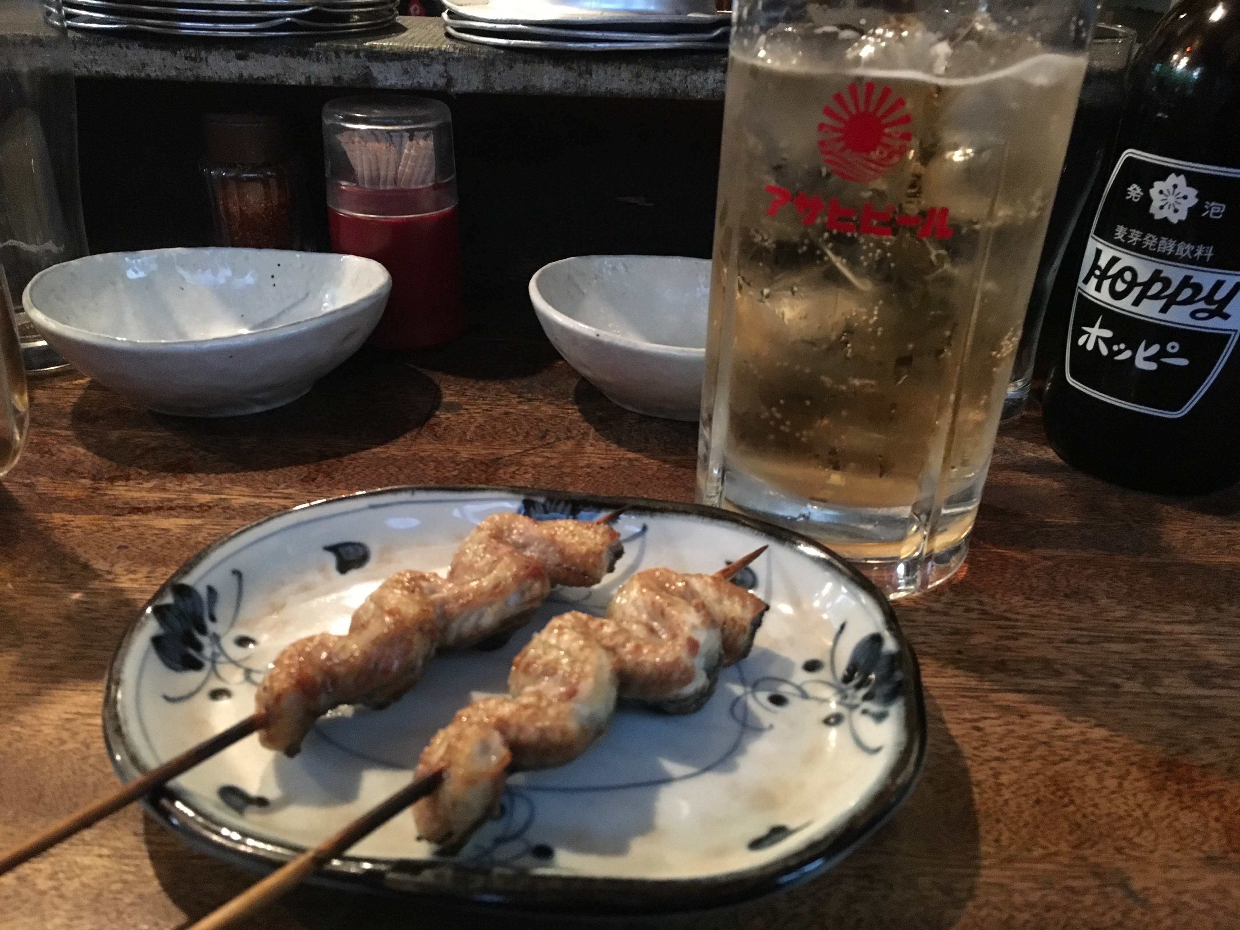 16時から並ぶ→お酒を飲む→おつまみ(キャベツ)を食べる→お酒を飲む→少しの鰻串を食べる(まだお腹減ってる)→お酒を飲む→少しの鰻串を食べる(全然お腹減ってる。むしろ逆に食欲をそそられている!!)